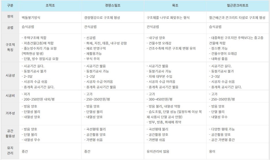 주택은 구조형식에 따라 크게 조적조, 경량스틸조, 목조, 철근콘크리트조 등으로 구분된다.