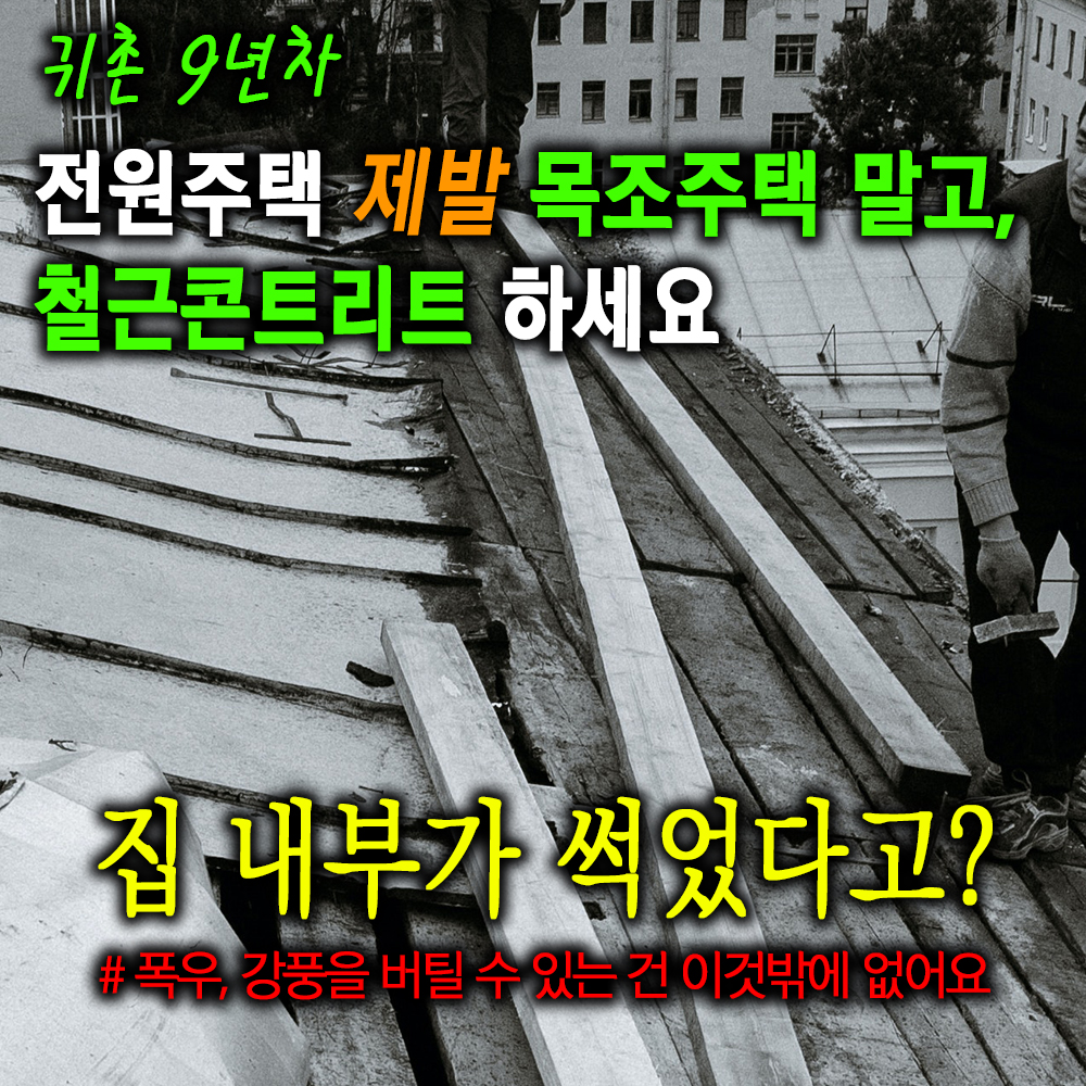 이렇다 보니 목구조 주택은 사는 내내 집에다 계속 신경을 써야 하는 피곤한 상황이 지속되고요. 그에 비해 상대적으로 철근콘크리트 주택은 외력과 투습에 강하다 보니까 변형도 거의 없고, 썩을 일도 없어서 신경을 조금 덜 써도 되는 장점이 있어요~
